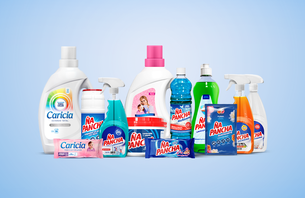 Todos los productos libres de fosfatos incluyen: Ña Pancha lavavajilla líquido, lavavajilla en pasta, jabones de lavar, suavizante, multisusos, cloro en polvo, quitagrasa, limpiavidrios y limpiabaños; y Caricia, con sus jabones de lavar, suavizante y detergente líquido.